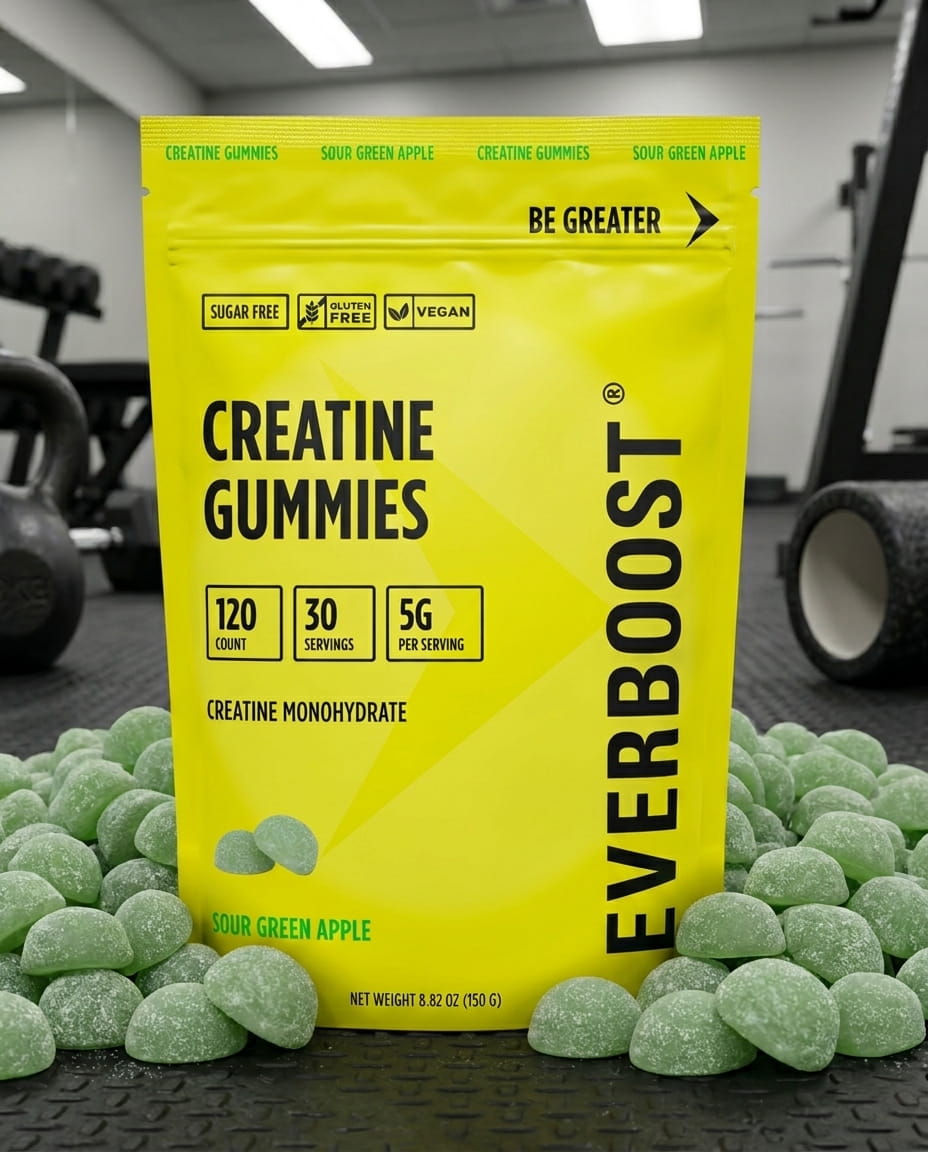 Forget powders and messy shakes. These sugar-free creatine gummies by Everboost deliver a full 5g of creatine monohydrate in a clean, convenient format that supports strength, recovery, and performance all in a tasty sour green apple gummy.